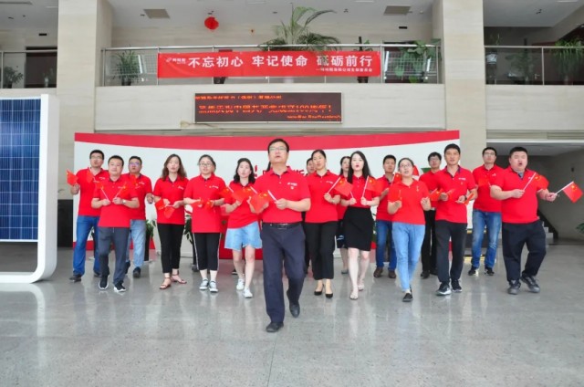 聽到熟悉的樂曲響起,阿特斯光伏電力(洛陽)有限公司的黨員們從各個辦公室走出,隨著節(jié)拍舞動手中的小國旗,帶著滿腔的熱忱、昂揚的斗志,高聲唱起“他指給了人民解放的道路,他引導(dǎo)中國走向光明......”