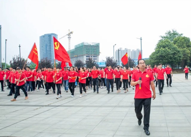 在他們身后,200名身著紅色T恤的黨員在董小輝、楊哲等帶領(lǐng)下,一邊揮動(dòng)手中國(guó)旗,一邊隨著樂曲向平臺(tái)緩緩匯聚,在平臺(tái)中心擺出了一枚鮮艷奪目的“黨徽”。