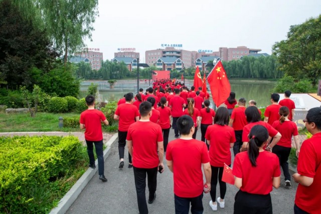 蔚藍(lán)的天空下,闊大的中心湖平臺(tái)上,一面鮮艷的黨旗高高聳立。兩名旗手高舉黨旗和國(guó)旗,沿著炎黃科技園黨建長(zhǎng)廊向平臺(tái)飛奔而來。